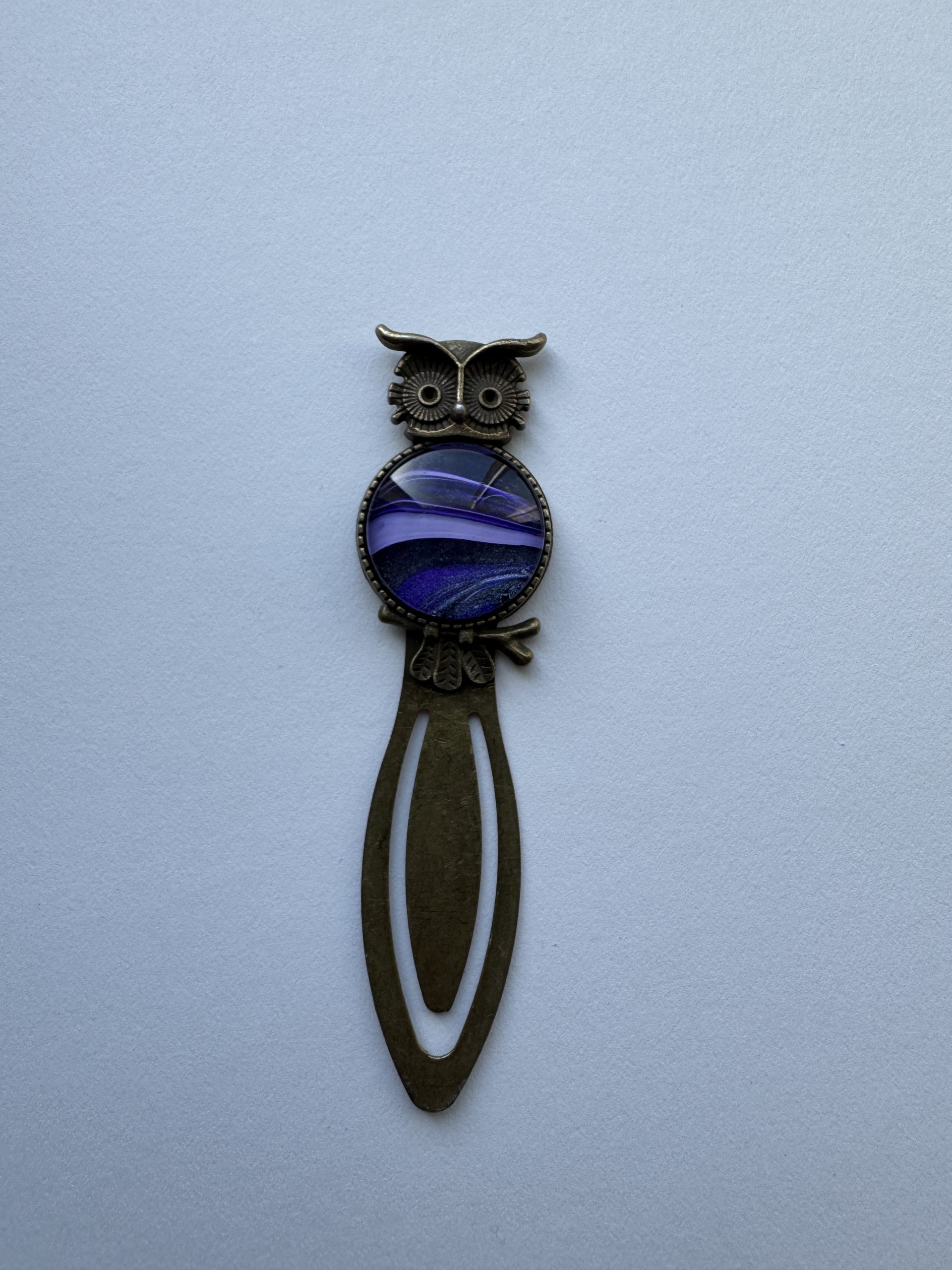 Metal bookmark with acrylic paint pour under glass cabochon. Bookmark is roughly 5″ H, 1″ W, and 1/4″ D.