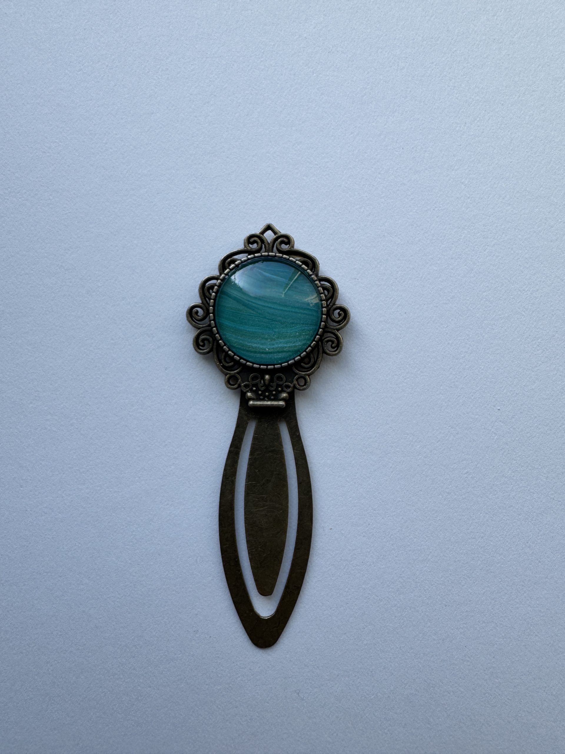 Metal bookmark with acrylic paint pour under glass cabochon. Bookmark is roughly 5″ H, 1″ W, and 1/4″ D.